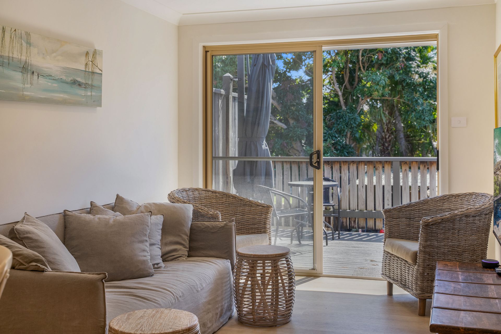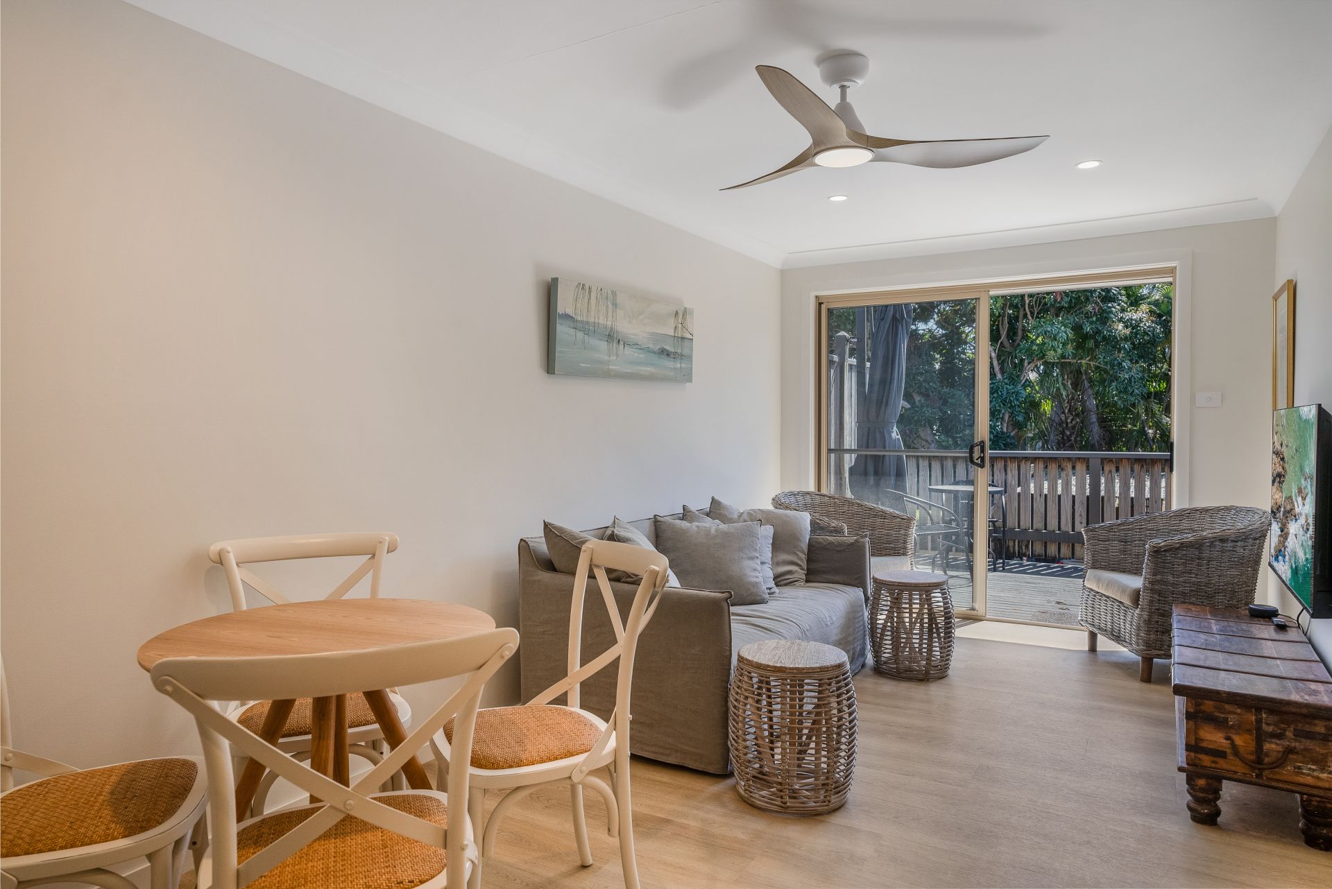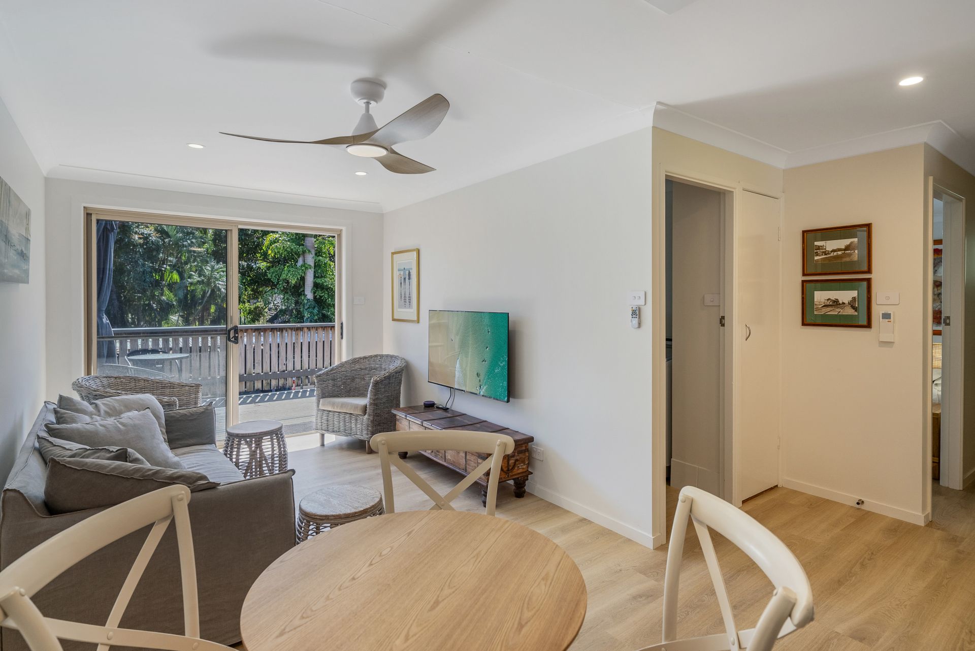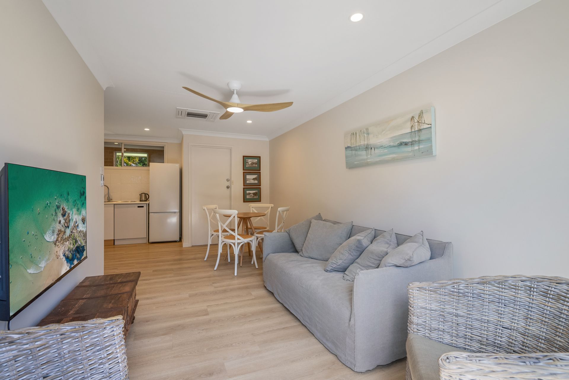 Newly renovated with a neutral colour palette throughout, this unit offers a fresh coastal style. Upon entry you are presented with the light and bright open plan kitchen, living and dining area, which opens to the spacious deck area through the glass siding doors. The kitchen is fitted with ample storage space, stainless steel appliances and a dishwasher. Throughout the entire unit is a fresh white paint colour, along with timber-look flooring. The lounge and dining area are styled with coastal inspired furniture, giving a relaxed and laid-back feel. The large timber deck is thoughtfully positioned to be Northeast facing, capturing sunlight all day long, with a shade umbrella included as well. As an added bonus, there is ducted reverse cycle air-conditioning!