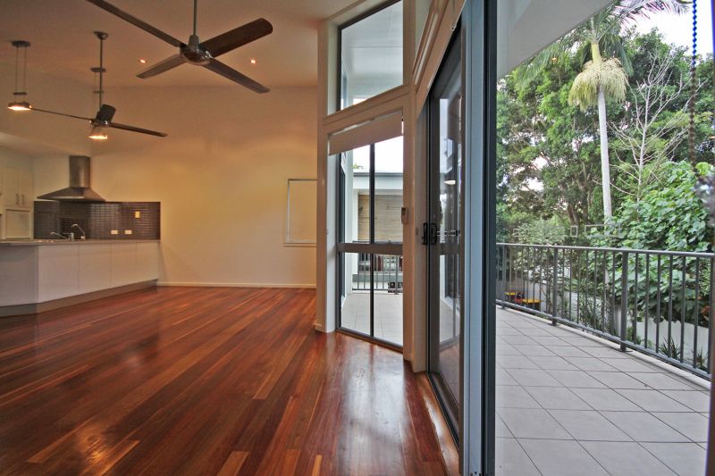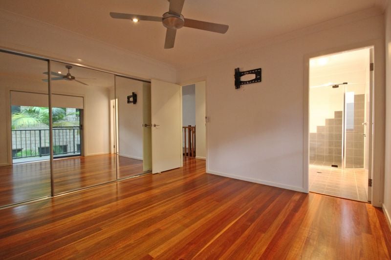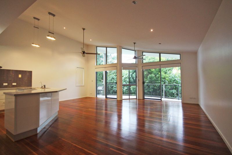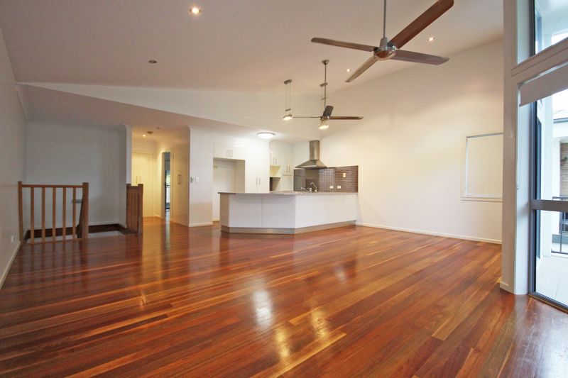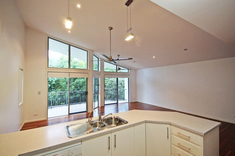 Upstairs, the expansive open-plan living, dining, and kitchen area is the heart of the home. Soaring raked ceilings and full-height windows allow natural light to flood in, creating an airy, inviting space that opens out to a large, covered balcony framed by lush greenery-ideal for entertaining or unwinding in the fresh air. Polished timber floors and modern pendant lighting enhance the space, while ceiling fans offer year-round comfort.
