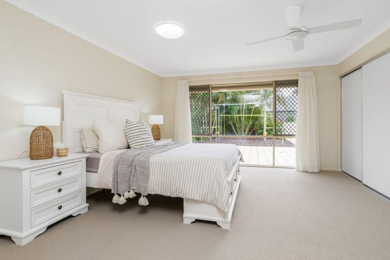 The master suite is positioned for privacy and relaxation, with views over the pool and palm-lined yard. It includes a generous ensuite with shower, vanity, and toilet, as well as an expansive built-in wardrobe. The additional three carpeted bedrooms are equally well-proportioned, each with built-in robes and serviced by a family bathroom and separate toilet.