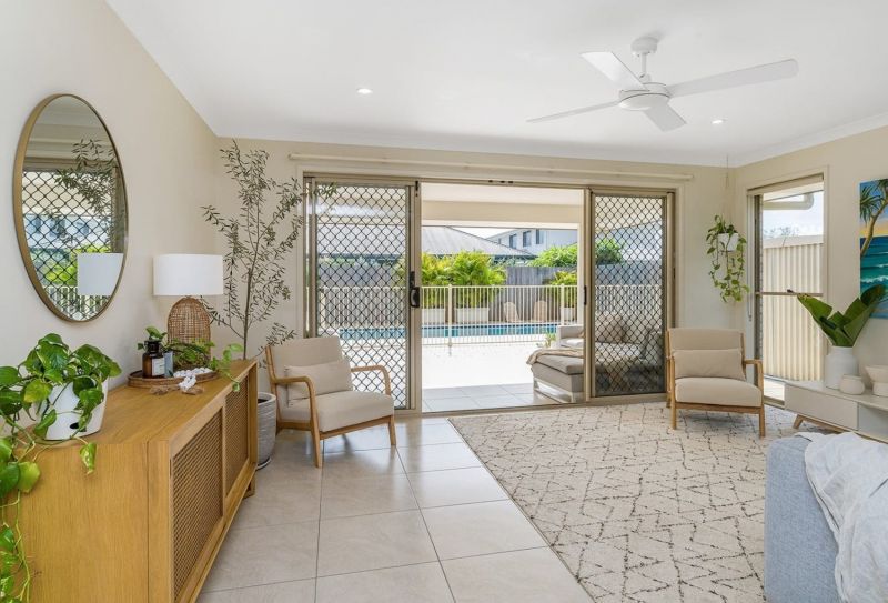 The open-plan living area flows effortlessly from indoors to out, ideal for entertaining or simply enjoying the coastal breeze. From the kitchen, there's a clear line of sight through the alfresco area to the inviting pool-perfect for keeping an eye on kids or hosting in style under the sun.