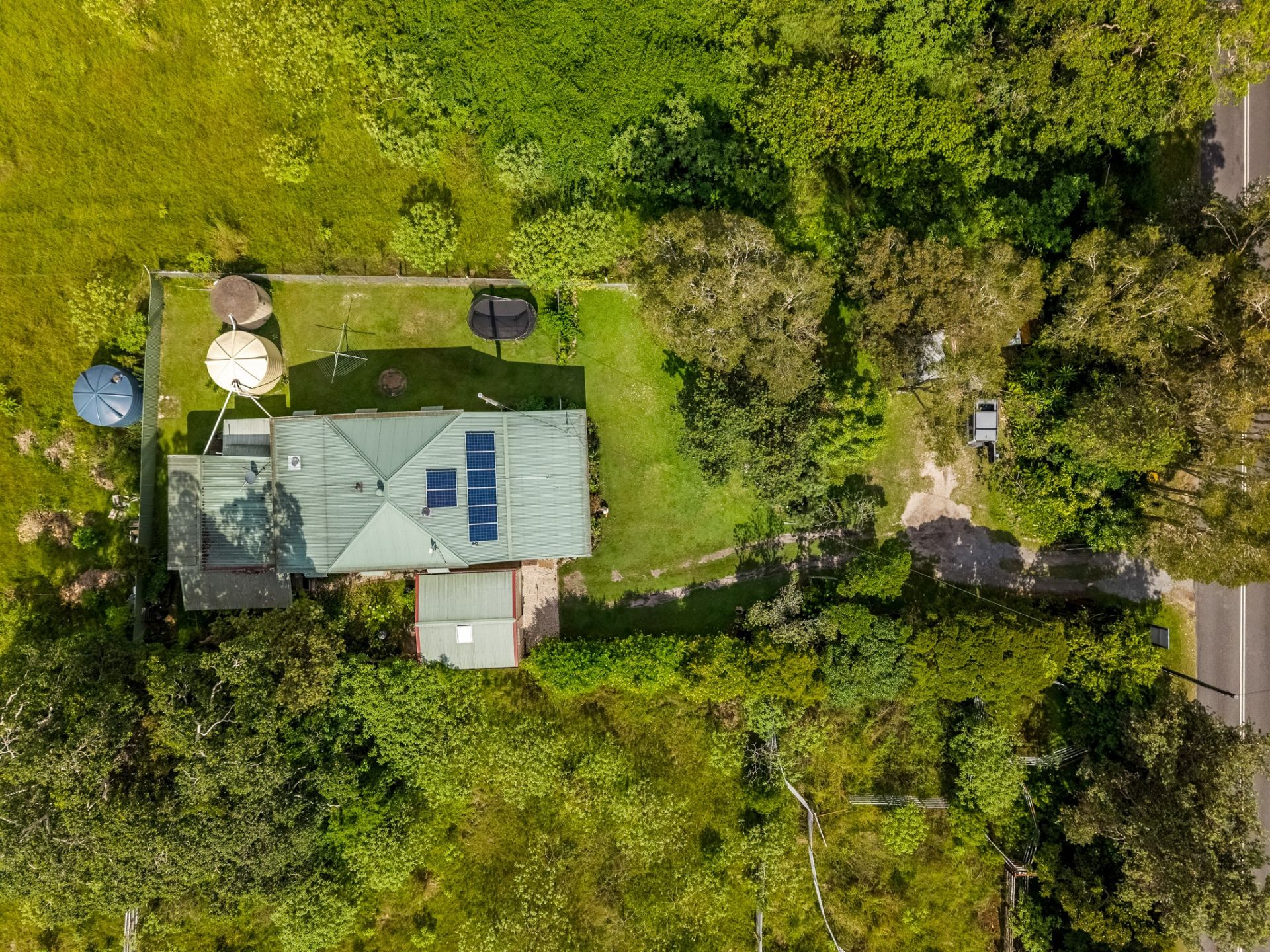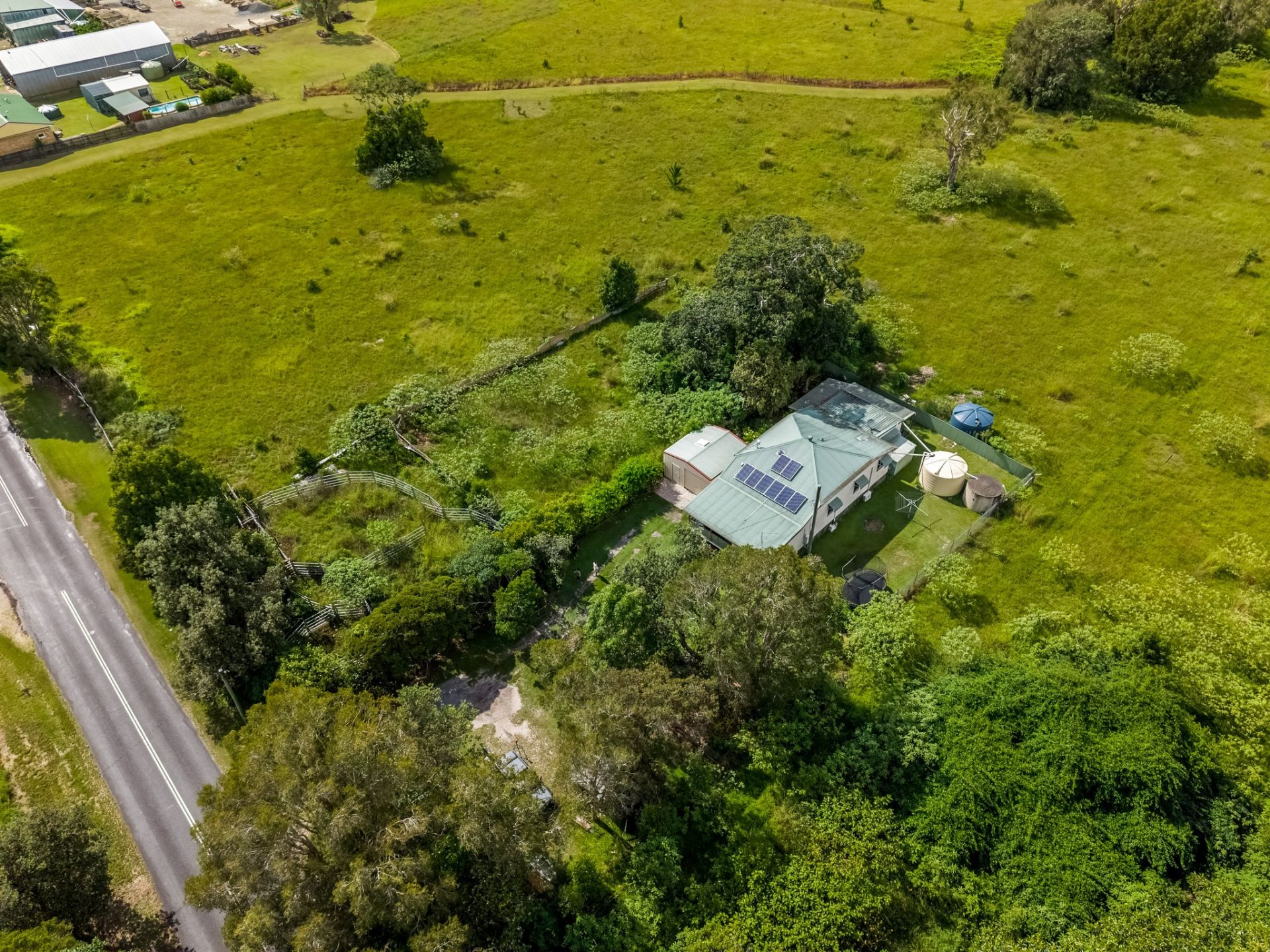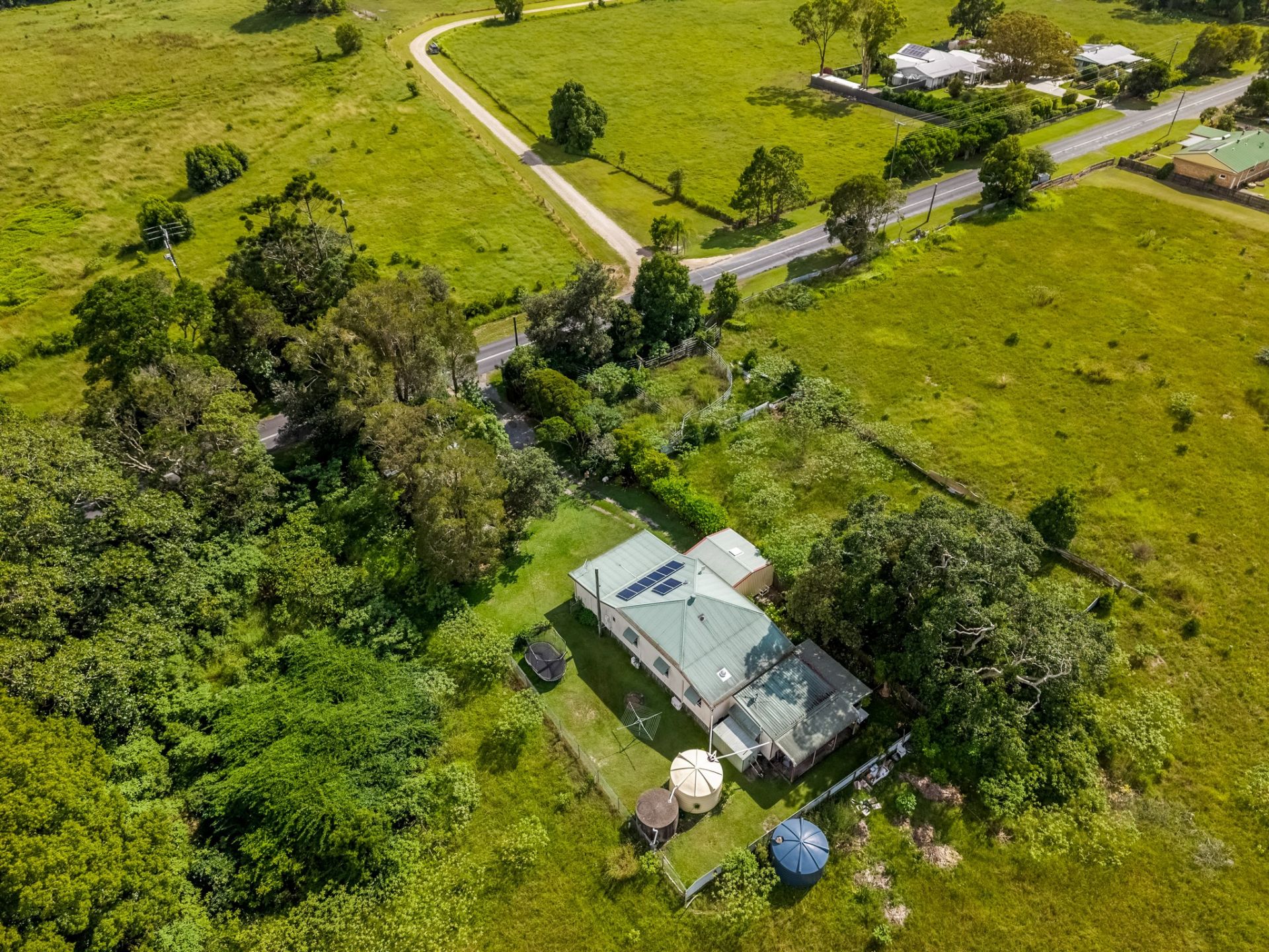Solar panels enhance energy efficiency, multiple water tanks support a sustainable lifestyle, and a separate garage provides secure parking or workshop space. The home's footprint sits comfortably within the allotment, leaving ample room for gardens, recreation or future enhancements.